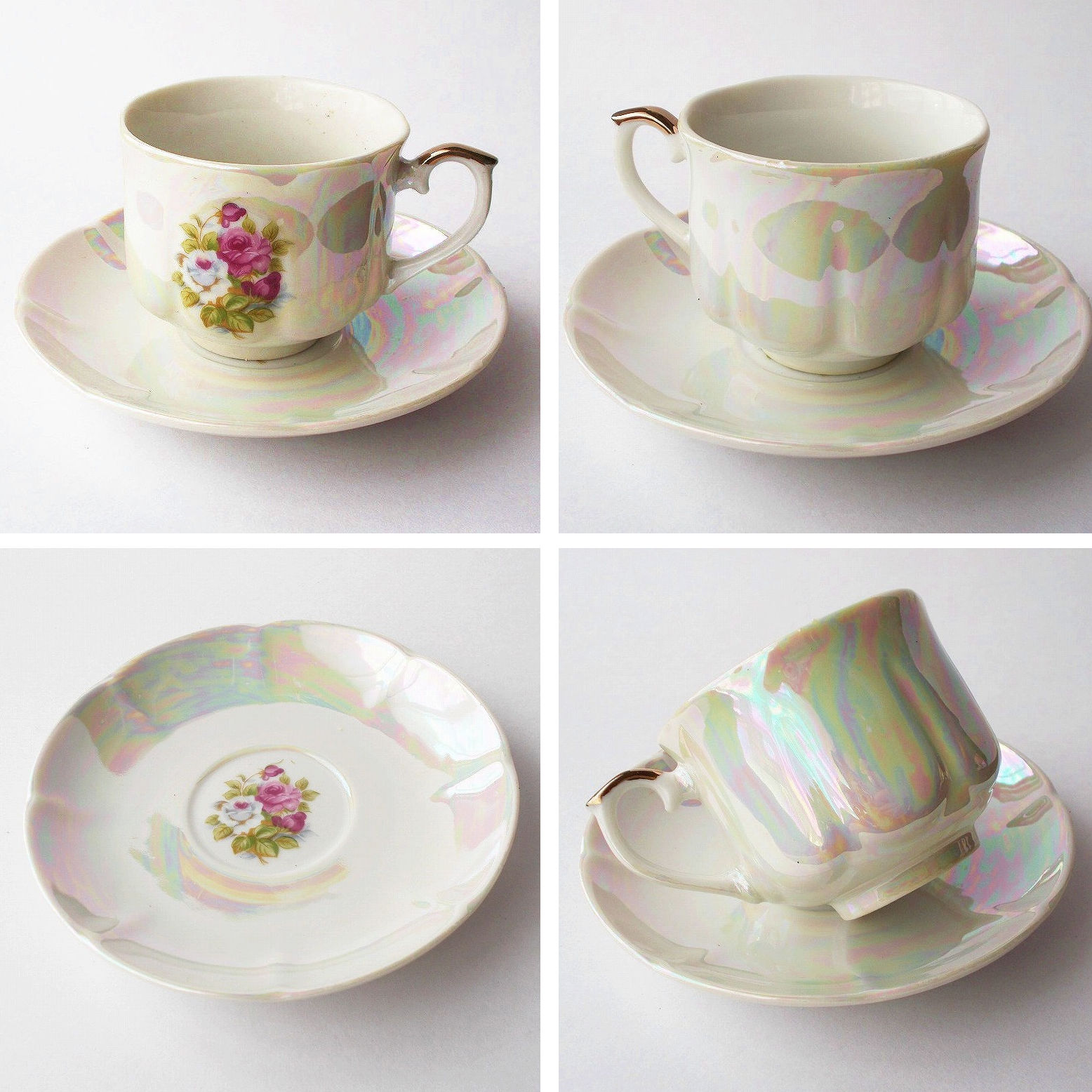 キラキラとした真珠色のラスター、間取りの中に白と赤のバラの花柄、金フチと、凝った形の持ち手のついた、とてもレトロなコーヒー碗皿です。